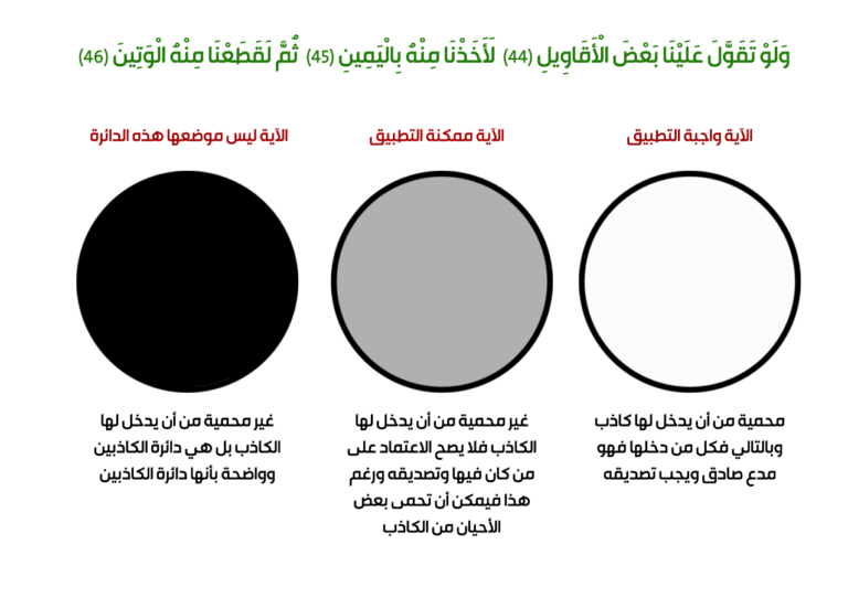 فالدائرة البيضاء محمية من آن يدخل لها كاذب وبالتالي فكل من دخلها فهو مدع صادق ويجب تصديقه فالآية (وَلَوْ تَقَوَّلَ عَلَيْنَا بَعْضَ الْأَقَاوِيلِ (44) لَأَخَذْنَا مِنْهُ بِالْيَمِينِ (45) ثُمَّ لَقَطَعْنَا مِنْهُ الْوَتِينَ) واجبة التطبيق في هذه الدائرة ،والرمادية غير محمية من أن يدخل لها الكاذب فلا يصح الاعتماد على من كان فيها وتصديقه ورغم هذا فيمكن أن تحمى بعض الأحيان من الكاذب بعد دخوله رحمة بالعباد رغم أنهم لا عذر لهم بإتباع من كان في هذه الدائرة فالآية ممكنة التطبيق على هذه الدائرة وليس واجبة التطبيق،والثالثة سوداء غير محمية من أن يدخل لها الكاذب بل هي دائرة الكاذبين وواضحة بأنها دائرة الكاذبين فلا داع لحمايتها أصلا من الكاذبين لا قبل دخولهم ولا بعد دخولهم فالآية ليس موضعها هذه الدائرة.