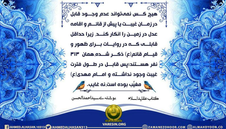 سید احمد الحسن (ع) در کتاب عقائد الاسلام میفرمایند: این مسئله که در روایات آمده که فرج درگرو آماده شدن ۳۱۳ مرد است، بیانگر همین انتظار امام مهدی است، یعنی این روایات بیان میکنند که فترت پیش از قیام قائم زمانی است که ۳۱۳ شخص آماده برای استقبال مهدی در آن یافت نمیشود ” یعنی قابلی و پذیرندهای برای خلیفه خدا در زمین و رسالت اصلاحی که او به دوش میکشد وجود ندارد و به همین سبب غیبت کبری پیش آمده است؛ و همچنان که در روایت بیان شده حجت خدا از میان آنها به علت تقصیرشان گرفته شده” و آمدن مهدی اول به این عالم جسمانی تا زمان مهیا شدن قابل، به تأخیر افتاد.