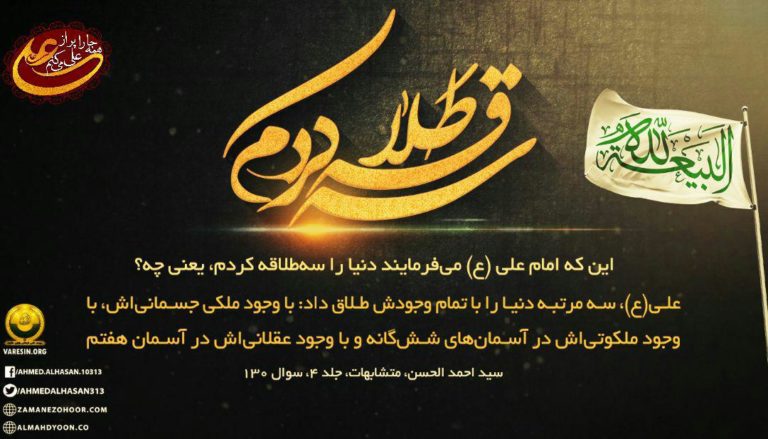 «…حضرت علی (ع) در کودکی به بازی و سرگرمی مشغول نشد، در جوانیاش به دنبال زیور و زینت و ظاهر نبود و در کهنسالی چیزی از میراث دنیا نیندوخت. ایشان (ع) همانگونه که خودش میفرماید، از دنیا سه مرتبه برید و دوری کرد؛ همچنین او سه مرتبه دنیا را با تمام وجودش طلاق داد: با وجود ملکی جسمانیاش، با وجود ملکوتیاش در آسمانهای ششگانه و با وجود عقلانیاش در آسمان هفتم». (کتاب متشابهات: جلد ۴ سؤال ۱۳۰)